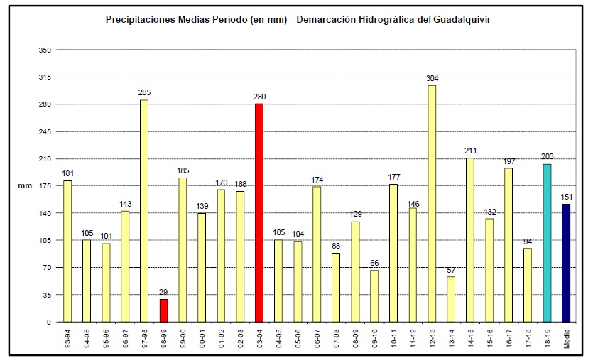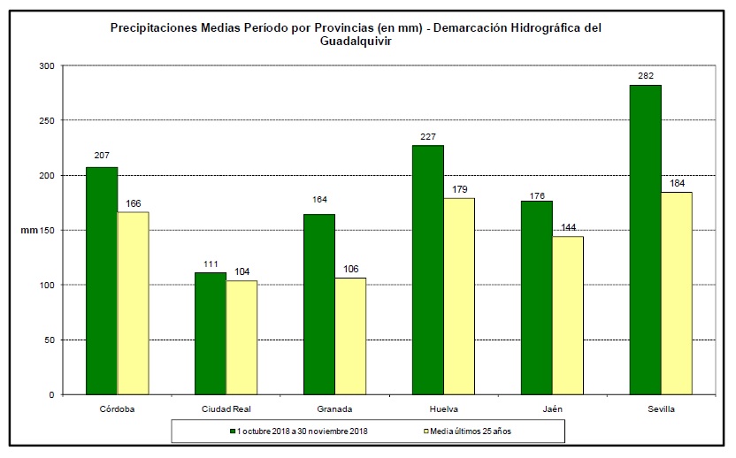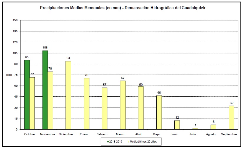 Las precipitaciones registradas a lo largo del pasado mes de noviembre en la Demarcación Hidrográfica del Guadalquivir han superado considerablemente la media establecida en los últimos 25 años para este mes. Según el informe pluviométrico mensual que elabora el Sistema Automático de Información Hidrológica (SAIH), en base a la red de pluviómetros instalados en los distintos embalses de la cuenca, la precipitación media en los embalses durante el pasado mes de noviembre ha sido de 108 litros por metro cuadrado, mientras que la media histórica correspondiente a este mismo mes se sitúa en los 79 l/m2. Esto significa que el pasado mes llovió en la cuenca del Guadalquivir un 37% más de lo que viene siendo habitual en noviembre.
