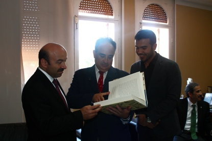 Manuel Romero entrega un libro sobre el patrimonio hidráulico del Guadalquivir a Harun Tüfekçi (izquierda)